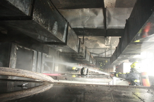 10時59分,北苑消防中隊作為第一力量到達火災現場。經過偵查后發現起火現場為四層鋼混結構建筑,廠區內呈回字形結構共有3家企業以及一個副食品倉庫。副食品倉庫和偉靈電鍍廠在同一棟建筑內,毗鄰建筑為創美家具有限公司廠房。起火地點位于廠區右側3樓偉靈電鍍廠車間,由于機器內部含有大量油漆、瀝青等材料,火勢燃燒十分猛烈。根據現場情況,消防隊員立即展開滅火戰斗,現場指揮員立即下令把現場攻堅組官兵分成兩個小組分別從兩側樓梯上樓內攻,防止火勢向周邊蔓延。當消防員來到3樓車間內時發現車間里面的機器由多個封閉的鐵箱子組成。內部油漆原料燃燒后冒出大量濃煙,溫度非常高。消防員進入后難以接近起火點。經過現場指揮員分析后決定先利用水槍對起火機器進行冷卻,然后對機器箱體進行破拆,最后出多支水槍打擊火勢。