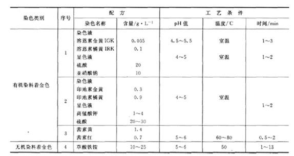 鈍化(三酸鈍化)→水洗→熱水洗→浸水溶性清漆[1:(5~20)]→水洗→晾干或烘干。 (3)仿金涂料工藝 仿金涂料工藝是在光亮白色鍍層上(鎳、銀)噴一層金黃色的透明漆,或在金色電泳涂料中進行陰極電泳,從而獲得美觀的金色涂層。 仿金涂料,可采用水性氨基仿金烘漆或聚氨酯仿金漆,也可在氨基清漆、聚氨酯清漆、硝基清漆、醇酸清漆等清漆中加入少量黃色與紅色染料自行配制(用醇溶染料)。不同品種的漆料有不同加工工藝,成本與質量也不同,依據產品要求選用。 對于非導體,如塑料、玻璃、陶瓷制品,可先進行真空蒸鍍鋁或化學鍍等方式獲得金屬層,再涂裝處理。 (4)鋁合金氧化著色 鋁一般采用硫酸陽極氧化后著金色(具體工藝見第7章),金色的染色液常用紅色與黃色調配,黃色多,紅色少, 鋁氧化著仿金色工藝規范