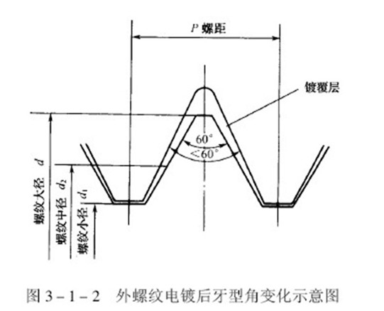 帶有普通螺紋的零件和緊固件,常遇到鍍覆后發(fā)生配合障礙的問題。當(dāng)螺紋進(jìn)行電鍍時,螺紋的牙尖部位和谷底部位的鍍層厚度是不一樣的,牙尖部位的鍍層厚度將明顯的大于谷底部位,隨著鍍層厚度的增加,它們之間的差異會越來越大,因此,螺紋的牙型角度變小,如圖所示。隨著螺紋直徑和螺距的不同,雖然牙尖和谷底部位鍍層厚度差異的比值也不同,但是隨著鍍層厚度增加,牙型角角度變小的傾向是始終如此的。螺紋直徑和螺距大一些,精度低一些,螺紋鍍后配合障礙就少一些,反之則多。實踐證明,螺紋電鍍后出現(xiàn)配合障礙的主要原因是牙型角鍍后的變形,其次才是鍍層厚度因素。